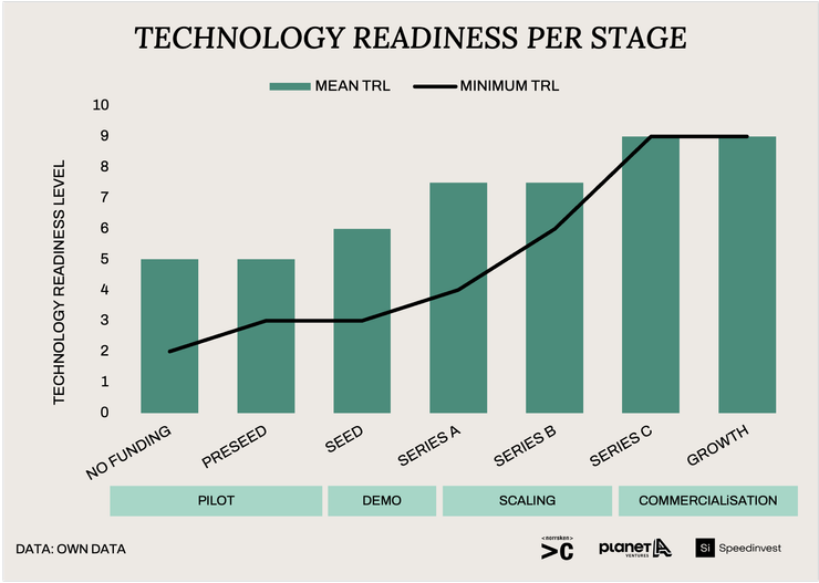Our survey suggests that preseed/seed funds would feel comfortable with a TRL of 2-3 whereas Series A investors would want to see a minimum TRL of 5. Later-stage investors would want to see de-risked technology and demonstrated unit economics and would only invest at TRL 9.
