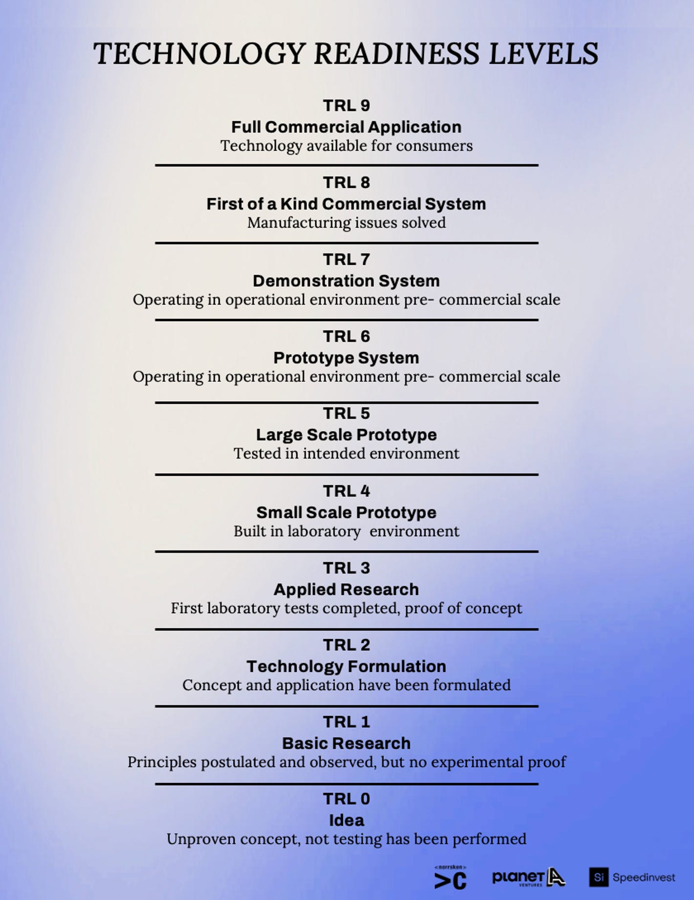 Technology Readiness Levels (TRL) should be used to assess a start-ups tech risk. At Norrsken, they look at deals at TRL 5+. This gives them two advantages: 1. It allows them to believe that the start-up they invest in might reach TRL level 9 within the 10-year time horizon of their fund and can thereby reach hyperscale. 2. It means that they donβt need the extended scientific expertise that it would require to assess earlier stage technological risk π» See an overview of TRLs below: